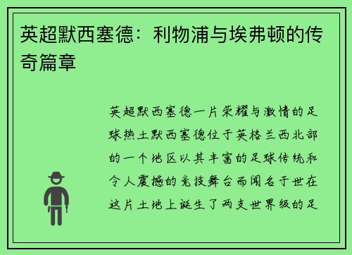 英超默西塞德:利物浦与埃弗顿的传奇篇章